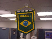 O hotel e a bandeirinha do Brasil na porta da sala de reunião…