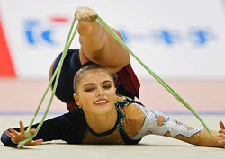 As ginastas competem em séries com bola, fita, arco, massa e corda. As minhas preferidas são a fita, pela beleza dos movimentos, e a bola, porque é inacreditavelmente difícil (todas são, mas a bola desliza muito, e manter o controle durante a série, no meio de um monte de acrobacias, é uma missão impossível). As russas são as estrelas, estão sempre levando medalhas em todas as competições.
