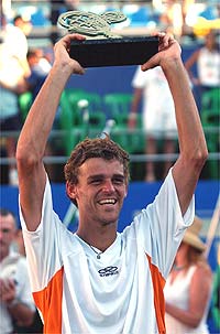 E não posso deixar de comentar a emocionante vitória do Guga ontem no Brasil Open. Nunca fiquei tão angustiada em um jogo, porque estava acompanhando só pela internet (aqui não passou na TV). Essas horas que a gente percebe o quanto a internet faz diferença e o quanto as transmissões ainda precisam melhorar. Ficava desesperada quando via os números do placar do UOL lá um tempão sem mudar, pensando o que estava acontecendo. Teve hora que eu estava com o placar UOL, Terra e Globo.com ao mesmo tempo abertos. O do Globo.com tava absolutamente atrasado e ainda estavam mostrando quem estava sacando errado. O do Terra tem os comentários, mas tava lento demais, enquanto o do UOL já estava em outro game eles ainda estavam mostrando o anterior. Ninguém tá transmitindo o jogo mesmo, imagem, vídeo, em banda larga não?