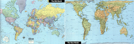 Segundo um artigo na Budget Travel de novembro (incrível, em 1 de outubro eu recebi a edição de novembro e só então me dei conta que a edição que eu tinha em casa em setembro já era de outubro), o mapa-mundi a que estamos acostumados é uma grande mentira geográfica. O mapa atual é baseado em desenhos de 1500, e mostra os países do Ocidente muito maiores e dominantes do que são na verdade. Segundo o mapa moderno, baseado em fotos de satélite, o Norte Africano engoliria a Europa inteira, compare os desenhos e veja as “pequenas” diferenças. O mapa novo se encontra a venda e o nome é Hammond Compact Peters World Atlas, por US$ 19,95. As escolas deviam comprar correndo…