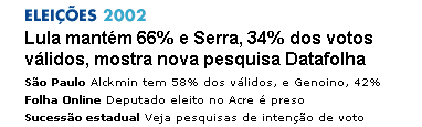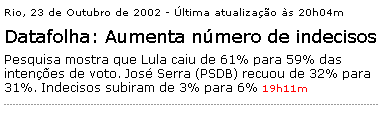 Só para explicar, ambas as chamadas estão corretas, a do UOL leva em conta o total dos votos válidos e a do Globo o total geral de votos. Eu consideraria a chamada do Globo mais imparcial, apesar de votar no Lula, se não fosse o fato de que a “queda” fica dentro da margem de erro da pesquisa, ou seja, não pode ser realmente considerada queda.