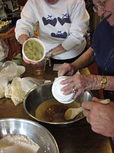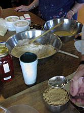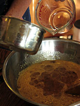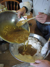 Depois o mel, o rum e as amêndoas, misturando com os ovos, e então acrescenta-se a farinha, misturando aos poucos.