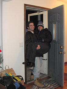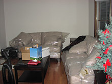 Como todos os nossos móveis e eletrodomésticos foram entregues diretamente aqui no endereço novo, a gente não teve maiores problemas, porque tínhamos somente roupas e objetos para trazer. Mesmo assim foram 6 carros completamente cheios de caixas. Fico imaginando se a gente estivesse transportando mobília, ia ser uma loucura. Para ajudar, nevou durante boa parte do dia, ventando absurdamente. O caminho da garagem para a porta da cozinha estava cheio de gelo e foi por sorte que ninguém caiu. O resultado foi a maior lama dentro de casa, já que todo mundo tinha que entrar e sair o tempo todo, pisando no gelo. Acabamos por volta de 18h, todo mundo morto de cansaço, e montamos a mesa da cozinha para jantarmos. Pedimos comida tailandesa para todo mundo que ajudou e fizemos nossa primeira refeição na nova casa. Logo depois chegou o meu sogro, uma tia, a avó do meu marido, todos trazendo algum presentinho (a maioria trouxe algum tipo de champanhe), e fizemos um brinde. Nem me lembro que horas fui dormir, apaguei.