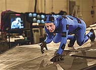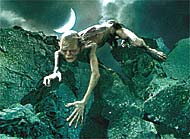 Acabei de ler na Veja (matéria só para assinantes do UOL) sobre o filme, eles tem umas fotos legais, como estas do Gollum abaixo: o ator, vestido com uma roupa azul para ser depois transformada no corpo do monstrinho e o resultado final nas telas. Ficou muito bom.