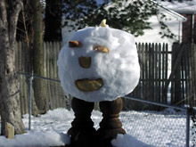 Ontem a noite fomos ver se a neve estava “no ponto” para fazer um boneco de neve. Eu nem sabia que tinha uma “neve específica” para fazer boneco de neve, mas vivendo e aprendendo…O problema é que quando está muito frio a neve fica esfarelenta, lembra um pouco areia, e por mais que você tente fazer uma bola, ela desmancha. A neve certa para fazer boneco de neve é um pouco molhada, quando está perto de derreter. O Gabe conseguiu a muito custo fazer uma bola de neve grandona, mas desistiu porque estava difícil de manter a neve compacta. Hoje de manhã esfriou ainda mais, então vou ter que continuar esperando a neve “certa”. Como a bola de neve continua lá fora, aproveitamos para fazer os olhinhos, nariz e boca, com pedaços de pão que estavam velhos.