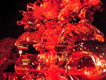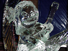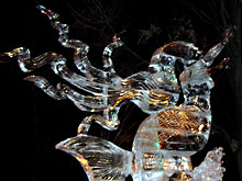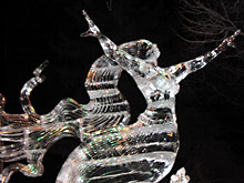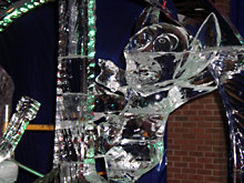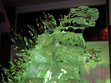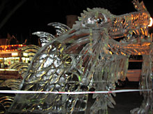Como vocês já devem ter percebido pelas fotos, esculturas de gelo são complicadas de fotografar: por causa da transparência, se não estiverem em um fundo neutro e sem luz direta, fica difícil distinguir as formas. Por isso as únicas fotos que considero boas são desta escultura da sereia abaixo, que por estar em um pedestal bem alto, acabava tendo o céu escuro como fundo.