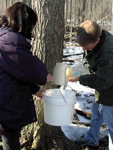 A Universidade de Michigan tem uma floresta no campus e eles durante esta época fabricam o maple syrup, e o processo é feito por voluntários. E aí lá fomos nós participar…Acontece assim: durante o inverno, com o frio que faz por aqui, as árvores “hibernam”, a seiva pára de correr pelo tronco e galhos, já que não tem as folhas e não tem a fotossíntese. Com a chegada da primavera e o aumento da temperatura, as árvores “acordam” e a seiva começa a correr de novo, e em abundância, para refazer as folhas perdidas. Existem muitos fatores que influenciam a coleta da seiva, como temperatura e precipitação, segundo a newsletter da Universidade de Michigan. No final do inverno então, é feito um pequeno furo nas árvores escolhidas e coloca-se uma bolsa plástica, que vai recolher a seiva quando ela começar a fluir. Como estava fazendo muito frio ainda, não tinha começado a correr a seiva até essa semana.
