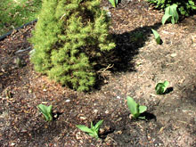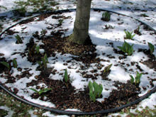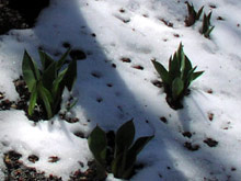 E para minha surpresa, as tulipas não só sobreviveram como cresceram bastante na semana passada. Quando cheguei na segunda só via as pontinhas das folhas enterradas na neve, mas ontem a neve derreteu quase toda e dá para ver bem como elas estão grandes.
