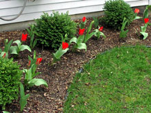 Ontem choveu muito, por várias vezes, durante o dia até o comecinho da noite. Desde quinta o tempo está chuvoso. Hoje foi a mesma coisa. Como meu marido explicou, isso é bem típico do mês de abril aqui, eles tem o ditado April showers bring May flowers (As chuvas de abril trazem as flores em Maio). E não é que hoje de manhã várias das minhas tulipas já estavam abertas? Levei um susto quando fui no jardim, abriram tão depressa, de um dia pro outro! Engraçado que só as vermelhas abriram; das amarelas, que estão intercaladas, não abriu nenhuma. Acho que amanhã ou depois as primeiras vão aparecer.