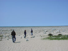 A maré estava baixa e andamos um bom tempo até a água, mas desistimos no meio do caminho de tanto frio. Estava fazendo 6 graus, mas com o vendaval era impossível ficar ali.
