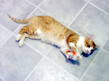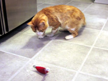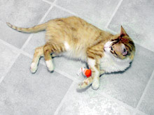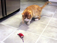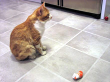 A minha colega de trabalho que achou o Gato e que eu já digo que é a madrinha dele, me deu ontem um MONTE de presentes para o bichano: brinquedos variados, duas tigelinhas de cerâmica com gato escrito em várias línguas, inclusive em português e um vale-presente numa pet shop. Eu fiquei chocada, nem sabia como agradecer, e tirei umas fotos do Gato em ação com alguns dos brinquedos que ele escolheu como preferidos, que estou colocando aqui. Ele simplesmente adorou o ratinho vermelho, ficou correndo atrás dele pela casa inteira (ele tentava pegar o ratinho e o que acabava acontecendo é que ele deslizava pelo chão e ia parar longe, o que causou uma verdadeira “perseguição”, com direito a miados e o brinquedo sendo carregado como uma presa no final).