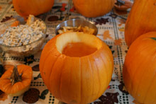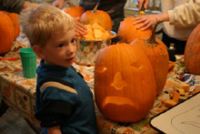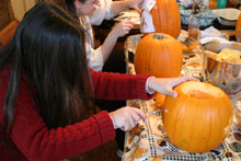 Passamos o sábado esculpindo as abóboras de Halloween, que é dia 31 próximo. Como todo ano, a família se reúne para a brincadeira, e vamos nos aperfeiçoando – pelo menos nós achamos as abóboras desse ano bem melhores que as do ano passado. Teve até repeteco: a abóbora do gato e a da vela, sucessos de 2002, voltaram este ano, graças aos moldes que foram preservados. As minhas criações foram as folhas de maple (peguei uma folha de verdade e desenhei o contorno antes de cortar) e as estrelas. Gabe fez uma aranha capenga (7 pernas ao invés de 8) e essa semana ainda vamos fazer mais…