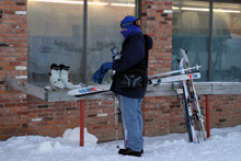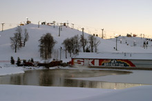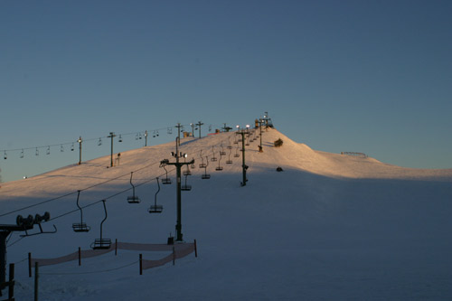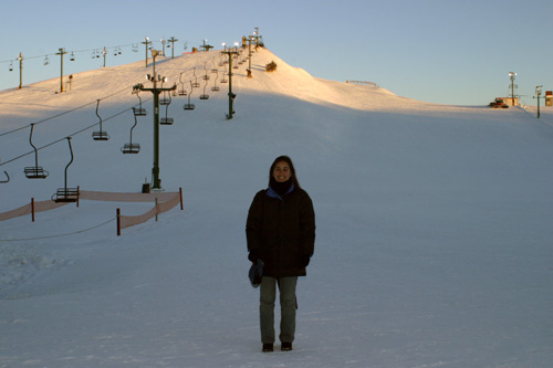 Gabe ficou me ensinando a parar, fazer curva, essas coisas básicas para controlar os esquis. Mas me deu um nervoso enorme, porque o lugar estava lotadíssimo (não nas descidas altas, mas nas pequenas, onde estavam todas as crianças) e eu estava com medo de atropelar alguém (como vi acontecer algumas vezes, felizmente sem graves consequências). Quando o lugar começou a esvaziar, lá pelas 16h, me aventurei a descer o morrinho – direitinho e sem bater em ninguém, para meu alívio. Fiquei lá brincando até o pôr-do-sol, quando já não tinha mais ninguém e eu resolvi arriscar umas curvas mais ousadas na última descida – acabei que levei um tombo e bati com o cotovelo no chão, que está doendo até agora, espero que eu não tenha quebrado. Mas tudo bem, foi divertido e provavelmente voltarei, mas em dia de semana, quando estiver vazio. Não tenho medo de cair e me machucar, só de machucar alguém que não tem nada com isso…