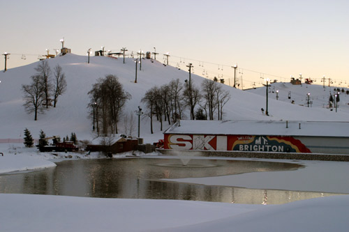 Quem conhece Michigan sabe o absurdo desse pensamento. Esquiar aonde nesse estado plano, que não tem nem um morrinho por quilômetros e quilômetros? Pois existe um lugar que fica mais ou menos a uma hora de carro de onde a gente mora, se chama Mt Brighton, e é um morrinho bem besta, daqueles que tem aos montes no Rio. Como aqui ele é único, virou a estação de esqui local, e todo mundo corre para lá no inverno.