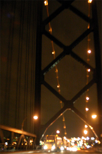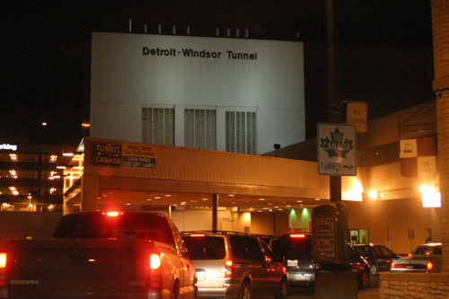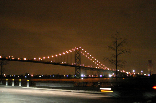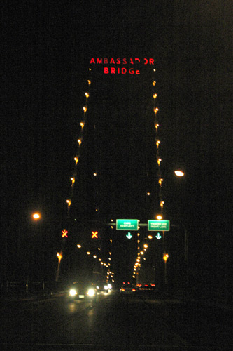 Na ida fomos pelo túnel que passa por baixo do Rio Detroit, e na volta viemos pela Ambassador Bridge, que é a ponte cartão-postal que liga as duas cidades e países. A imigração canadense foi em 5 segundos: olharam pra gente, perguntaram onde íamos e mandaram seguir. Assim, sem documentos nem nada. Já na volta, na imigração americana, o cara ficou enchendo o saco do Gabe, que não levou o passaporte – americano não precisa de passaporte para ir ao Canadá, mas eles estão querendo que todo mundo leve por razões de segurança. Ele ficou falando pro Gabe “ela é brasileira e eu não teria como saber se ela não falasse, então você podia ser qualquer coisa e eu não tenho como saber”, hehehe. Aí ele virou para mim e falou “não deixa ele sair de casa sem o passaporte não!”. Essa foi boa, o Gabe que é americano levando esporro da imigração! Mas foi tranquilo, o cara tava falando tudo rindo, só mesmo para dar um “hard time” pro Gabe não esquecer mais o passaporte.