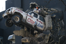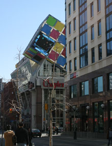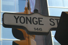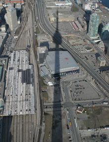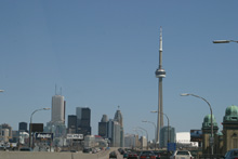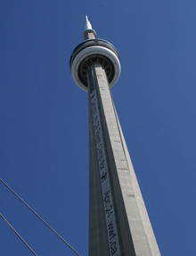 Fomos andando pela rua principal que corta Chinatown, passamos pelo prédio da ChumCity, uma emissora de TV, com o carro saindo da parede, o complexo de cinemas com arquitetura moderna, um bar com pinturas hippies, vimos um riquixá (que estão começando a aparecer mais e mais em Toronto), uma propaganda da cerveja Bavária (que vende por essas terras, já que foi comprada pela Molson, fábrica canadense), muitos skatistas na rua, ciclistas, placas em chinês, o Hard Rock Café com vista para dentro do estádio de baseball e pronto, chegamos à CN Tower.