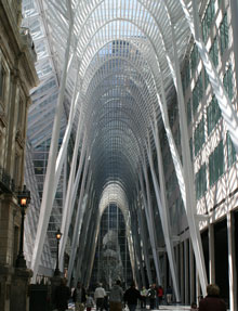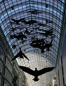 Sexta fez um dia bonito de sol e céu azul perfeito. Fomos para Toronto e começamos o dia no restaurante Marché, que tem de tudo um pouco. Você entra, recebe um cartão onde vão marcar o que você comer, escolhe uma mesa e aí começa a circular entre as várias barraquinhas com os mais diversos tipos de comida, de sushi à quiche, passando por massas, sanduíches na baguete, saladas, sucos naturais, frutos do mar incluindo ostras frescas, vinhos, tudo com uma cara ótima, muito legal. Uma dificuldade enorme para escolher, uma pena que não é por quilo, as porções são grandes e não dá para experimentar um pouco de tudo como dá vontade. Eu comi sushi, que estava ótimo, Gabe atacou um omelete e o Rafa foi de massa. Tudo aprovado, incluindo as sobremesas, cheesecake de chocolate e de framboesa e blueberry, da barraquinha de sobremesas que tinha cada torta fantástica. O restaurante fica dentro de um espaço muito bacana, com telhado de vidro e o corredor em arcos que me lembraram logo dos projetos de Gaudí, o efeito é lindo.
