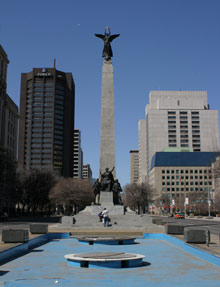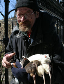 De lá começamos a andança: Yonge Street, a rua mais badalada, cheia de lojas de todos os tipos. Andamos até a rua onde fica o shopping center que tem esses gansos pendurados (que ficamos de voltar depois e acabamos não voltando), continuando em direção de Chinatown, passando pelo prédio antigo e depois o novo da prefeitura, a construção da nova ópera e esse cara doido segurando o monte de ratos (logicamente eu tive que pedir pra tirar uma foto, ARGH).