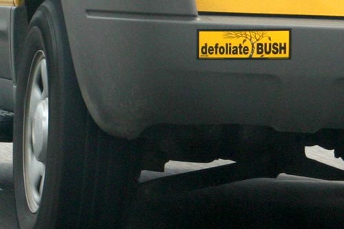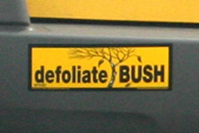 Estávamos dirigindo semana passada numa avenida movimentada aqui perto de casa quando vi esse carro com o adesivo da foto ao lado. Não é engraçadinho? Para quem não entendeu a brincadeira, bush em inglês é moita, arbusto, e defoliate é desfolhar. Tem outros melhores nos carros por aqui, quando eu encontrar alguns tiro fotos (e tem uns que são anti-Kerry também, absolutamente irritantes).