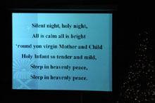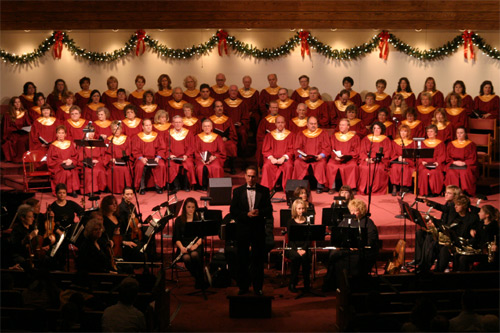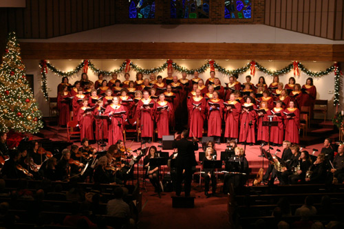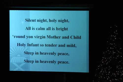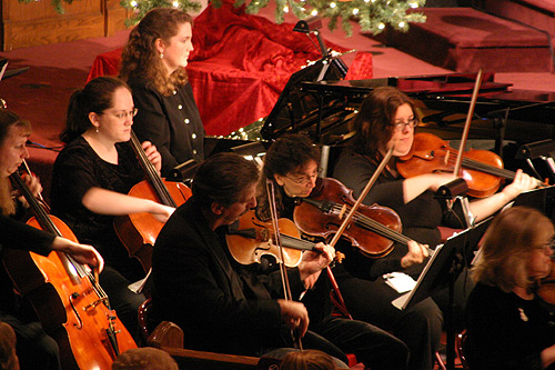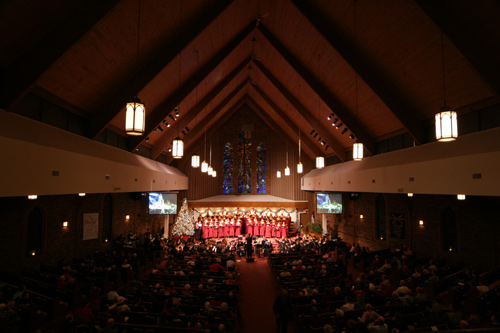 Todos os anos meu sogro toca viola em concertos de Natal. Um em uma igreja presbiteriana e outro com a Orquestra de Macomb, em um teatro. A gente sempre vai assistir a este na igreja porque tem um coral maravilhoso que canta as músicas com a orquestra, e no final, eles projetam em um telão várias letras de músicas de Natal tradicionais e todo mundo canta junto.