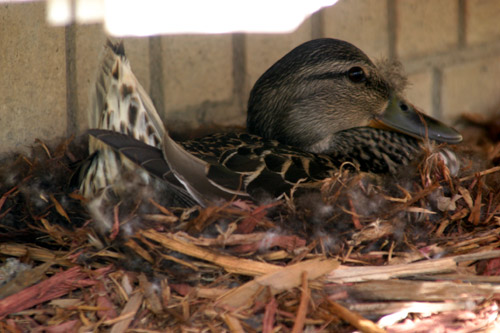 Uns anos atrás uma pata fez ninho debaixo de uma moita na frente da casa do meu vizinho do outro lado da rua (ô descrição complicada). Nasceu um monte de patinhos, que ela levou umas vezes passear na vizinhança. Depois foram todos embora, sabe-se lá para onde.