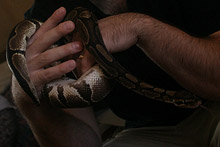 A namorada do meu cunhado é professora de ciências para a 4a série e tem vários bichos em classe para que as crianças possam estudar. Essa cobra, Pickle, é um desses bichinhos. Durante as férias de verão ela traz os bichos para casa ou então algum aluno leva para cuidar, até que as aulas comecem novamente e os bichinhos sejam levados de volta para a escola. Essa cobra não é venenosa, claro, é uma jibóia, então a gente resolveu brincar com ela um pouquinho, hehe.