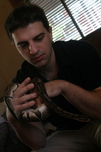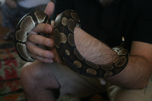 A namorada do meu cunhado é professora de ciências para a 4a série e tem vários bichos em classe para que as crianças possam estudar. Essa cobra, Pickle, é um desses bichinhos. Durante as férias de verão ela traz os bichos para casa ou então algum aluno leva para cuidar, até que as aulas comecem novamente e os bichinhos sejam levados de volta para a escola. Essa cobra não é venenosa, claro, é uma jibóia, então a gente resolveu brincar com ela um pouquinho, hehe.