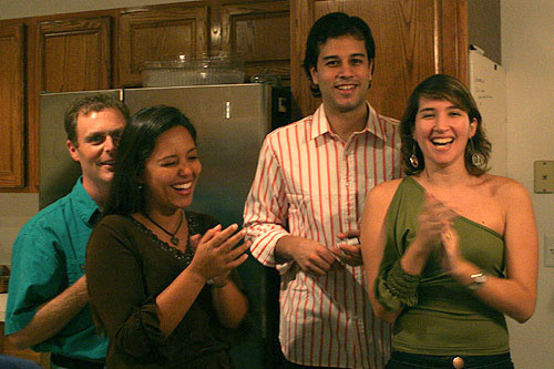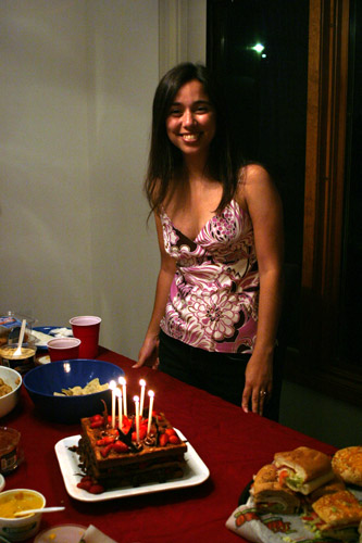 Chamei amigos do trabalho e os amigos brazucas, comprei umas coisinhas brasileiras, como coxinha e guaraná, a Andrea (brasileira que mora pertinho de mim e que conheci através do Orkut!) nos ensinou a fazer capirinha na hora e todo mundo tomou um pouco 😉 A Erika (que trabalhava comigo na agência) fez esse bolo lindo e delicioso, e os últimos a sair foram embora lá pelas 2h da manhã, então curtimos bastante. Quase não tiramos fotos, uma pena, depois quando vi as poucas fotos que tiramos é que me dei conta disso – acabou que um monte de gente não apareceu em nenhuma foto. E claro, não posso deixar de agradecer os presentes e cartões fofos e todos de muito bom gosto que eu recebi 🙂 Thanks!
