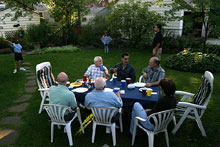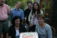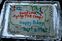 Não está muito frio (durante o dia pelo menos), então aproveitamos pra fazer um churrasco. O bolo (que a minha sogra fez, ela sempre inventa alguma coisa pra escrever no bolo) foi em forma do mapa dos EUA, eu e Gabe voando pra Seattle e o Brent voando pra Cincinnati. Passamos o dia comendo muito, porque todo mundo resolveu trazer trocentas sobremesas e quando foi escurecendo (e esfriando), acendemos o fogareiro no deck pra esquentar – e o papo ao pé do fogo foi até altas horas da noite. Só interrompemos o falatório para brincar com alguns fogos, que não poderemos levar na mudança, então temos que usá-los. Foi um dia delicioso de outono!