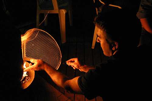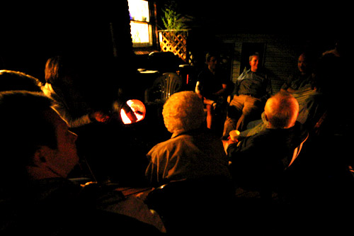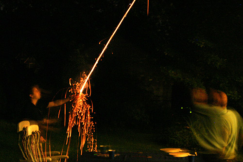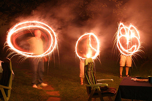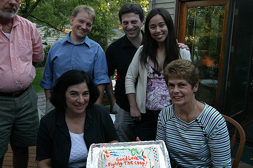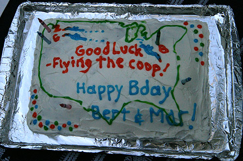 Não está muito frio (durante o dia pelo menos), então aproveitamos pra fazer um churrasco. O bolo (que a minha sogra fez, ela sempre inventa alguma coisa pra escrever no bolo) foi em forma do mapa dos EUA, eu e Gabe voando pra Seattle e o Brent voando pra Cincinnati. Passamos o dia comendo muito, porque todo mundo resolveu trazer trocentas sobremesas e quando foi escurecendo (e esfriando), acendemos o fogareiro no deck pra esquentar – e o papo ao pé do fogo foi até altas horas da noite. Só interrompemos o falatório para brincar com alguns fogos, que não poderemos levar na mudança, então temos que usá-los. Foi um dia delicioso de outono!