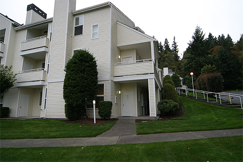 Nosso apartamento temporário em Redmond, estamos no térreo. Vista da nossa porta da frente.