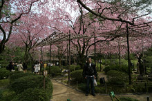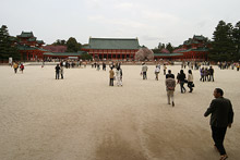 Com o tempo nublado, pegamos o metrô até o templo Heian. É um templo mais novo, bem grande, e o destaque é o jardim japonês cheio de cerejeiras em flor em volta. Estava lotadíssimo, domingo com cerejeiras em flor = todos os japoneses da cidade indo aos templos e depois fazendo seus picnics. Muitas mulheres de kimono, uma graça. Fomos andando pelo jardim maravilhoso, com cerejeiras de flores brancas e cor de rosa, vários lagos com carpas, caminho de pedras atravessando o lago. Uma ponte de madeira coberta atravessa o lago maior, e era o ponto preferido para fotos. Um casal recém-casado posava para fotos na beira do lago e tinha uma multidão de gente ao redor tirando fotos deles, a cada vez que a noiva se mexia eram oooohhhs pra todo lado.