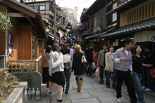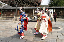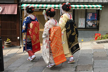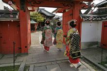 Continuamos andando por Gion, o distrito famoso das geishas, que ainda preserva suas ruas estreitas e casas de madeira. No caminho para uma das pagodas, demos de cara com três maikos (aprendizes de geiko, como as geishas de Kyoto preferem ser chamadas). Lindas, pareciam bonequinhas de porcelana, foram até um pequeno templo, mas não queriam ser fotografadas (uma turista apontou a câmera para uma delas e elas cobriam o rosto com as mãos e viraram de costas para a câmera).
