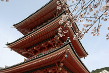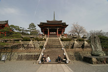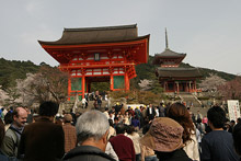 Fomos andando pelas ruazinhas estreitas que a esse ponto já tinham se transformado em um rio de gente (vimos mais algumas maikos no caminho) até o templo Kyomizu. Esse templo tem mais de mil anos e fica no topo de uma colina, dá para ver a cidade toda lá de cima. A estrutura do templo, toda de pilares de madeira, não tem nenhum prego: é tudo de encaixe. O tempo melhorou bastante e o sol apareceu, as cerejeiras emolduravam o templo perfeitamente. Os japoneses faziam fila para beber a água da nascente do templo, os restaurantes ao redor todos cheios, as lojas de souvenir lotadas.