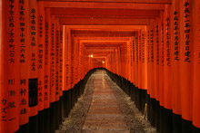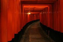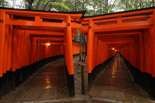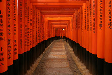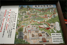 O templo fica pertíssimo da estação, você literalmente atravessa a rua e já está no primeiro arco vermelho da entrada. Esse templo é famoso pelos seus milhares de arcos vermelhos, literalmente um túnel de arcos que cobre uma trilha pela floresta que vai subindo o morro (quem viu o filme Memoirs of a Geisha vai lembrar dos arcos). Não subimos nem a metade do caminho, a trilha é enorme (vejam a foto do mapa da trilha, com os arcos subindo o morro)), passa por lagos, templos menores e deve ter uma vista legal lá de cima em um dia de céu azul.
