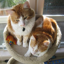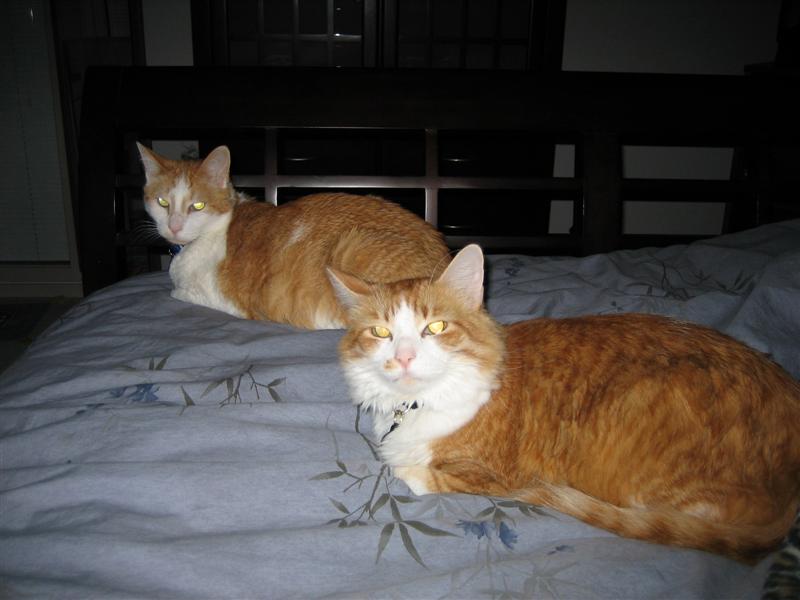 17 dias depois, chegamos de viagem e fomos buscar nosso gatinho. Para nosso surpresa, Gato e Jake ficaram amigos! Nós sabíamos que eles iam se comportar bem, mas o Gato já tinha convivido com os bichanos do meu cunhado e mesmo meses depois ele ainda se comportava de forma diferente, não ronronava de jeito nenhum e não dormia mais com a gente; ele estava sempre de olho nos outros gatos, como se estivesse desconfiado. Então eu não esperava que Gato e Jake fossem ficar amiguinhos em tão pouco tempo, dormindo na cama juntos a noite, brincando juntos, meu colega disse que até limpar a cara um do outro eles limpavam!!!! Vejam as fotos, não são muito fofos? Ficamos com pena de separá-los, mas fazer o quê…