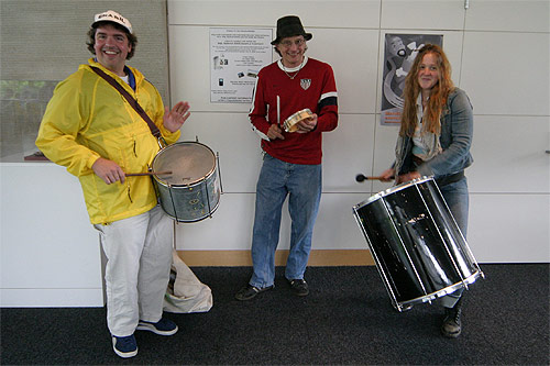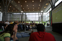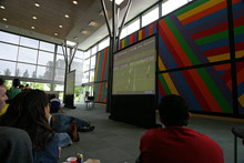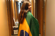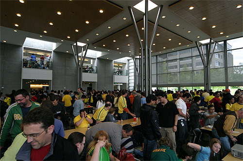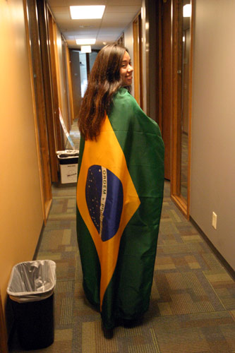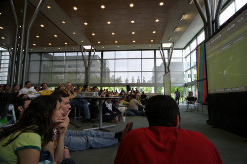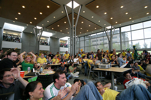 Os brasileiros aqui na Microsoft se reuniram todos na lanchonete do prédio 34 pra assistirem a Brasil e Croácia. Tinham alguns croatas por lá também, volta e meia um deles dava um gritinho e a galera verde-e-amarela ria e aplaudia. Foi bem animado, estava lotado, a lanchonete serviu feijoada, teve um pessoal tocando um sambinha e até uma passista apareceu. Alguns dos colegas do meu time também foram, vestiram a minha bandeirona brasileira e tudo, enfim, melhor que isso só se estivesse assistindo no Brasil mesmo. Os comentaristas da ESPN estavam o tempo todo exaltando o time brasileiro e Ronaldinho, e perguntando porque o Ronaldo ainda estava em campo já que não estava fazendo nada (a galera toda vibrou quando o Ronaldo foi substituído).