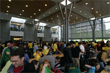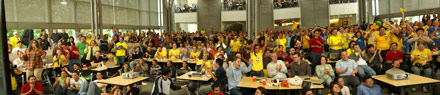 Luciana, quanta gente…quanto brasileiro…muito legal da parte da empresa, preparar um espaço para o pessoal assistir os jogos. A foto panorâmica ficou muito legal. Aqui no Brasil, estamos torcendo para a cada jogo o Brasil mostrar o futebol que nos anima tanto, os garotos estâo aquecendo, assim esperamos. Um ótimo final de semana, beijos.