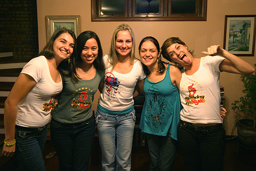 No sábado foi o jogo ridículo Brasil x França, assistimos na casa dos meus pais e foi todo mundo pra lá, meus tios e primos. Arrastamos móveis pra todos os lados pra todo mundo poder ter um espacinho pra assistir o fiasco 😉 Mas o jogo acabou e não ficamos abalados não; eu, Gabe e meus primos fomos para o boliche e depois pra um bar, ninguém nem falou de futebol. E para tirar as camisas do Brasil que estávamos vestindo pra acabar com o clima ruim, pegamos camisas da coleção feminina da Que! Life Style (que é do meu irmão e sócios) e pronto. O meu primo Leandro tirou várias fotos no boliche mas não me mandou nenhuma, grrrr.