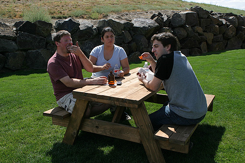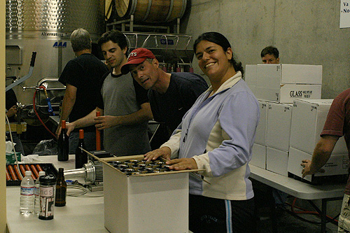 Fomos a Walla Walla neste final de semana para ajudar a Aline e o Ryan a engarrafar um dos vinhos que ele produziu este ano. Este é o segundo ano da Tertulia Cellars, que é a vinícola do Ryan. Passamos o sábado na vinícola que ele aluga para guardar e engarrafar os vinhos, estávamos engarrafando o Shiraz dessa vez. O processo que ele usa é semi-automático – as máquinas fazem o trabalho mas tem que ter gente passando as garrafas de uma máquina para outra. E lá fomos nós: tirando as garrafas das caixas, colocando nitrogênio na garrafa, enchendo com o vinho, colocando rolha, colocando o protetor de rolha e finalmente, colocando as garrafas nas caixas. Só faltaram os rótulos, que não chegaram a tempo e vão ter que ser colocados depois. Paramos na hora do almoço para um churrasco americano lá fora e voltamos ao trabalho até o final do dia: quase 300 cases engarrafados! Ganhamos algumas garrafas devidamente personalizadas com gracinhas que o Ryan escreveu com todas as piadas de vinho que rolaram durante o dia, e eles nos levaram para jantar em um restaurante bem legal na cidade, chamado Marc. A comida estava ótima e bebemos o Shiraz que engarrafamos durante o dia e eu ainda tomei uma taça do viognier que eles fizeram no começo do ano, que eu gosto muito. Foi cansativo mas muito legal! 🙂