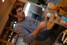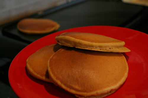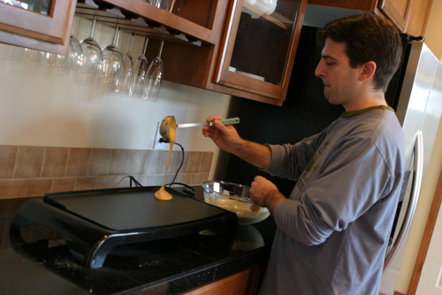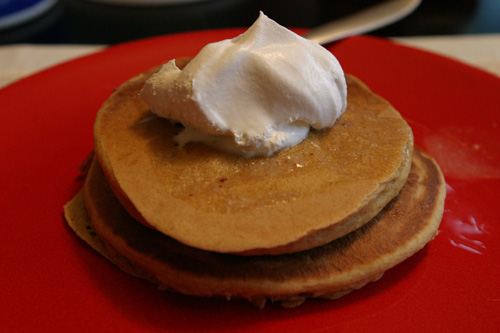 Para acabar com as áboboras, peguei essa receita de panquecas de abóbora e passei para o mestre de panquecas da casa, o Gabe. Ele cozinhando e eu fotografando, hehe. Ele seguiu a receita à risca, e as panquecas são deliciosas. Um pouquinho de chantilly em cima e pronto, nham nham.