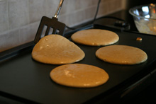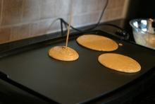 Agora pra fritar as panquecas o ideal é ter uma chapa, mas se você não tiver, pode fazer numa frigideira anti-aderente que dá certo também. As panquecas americanas são grossinhas, não são finas que nem um crepe. Coloque a massa no grill ou na frigideira com uma colher ou concha, como preferir. Cozinhe um lado, vire pra cozinhar o outro, até dourar um pouquinho.