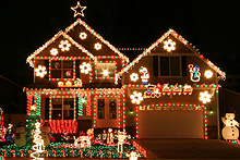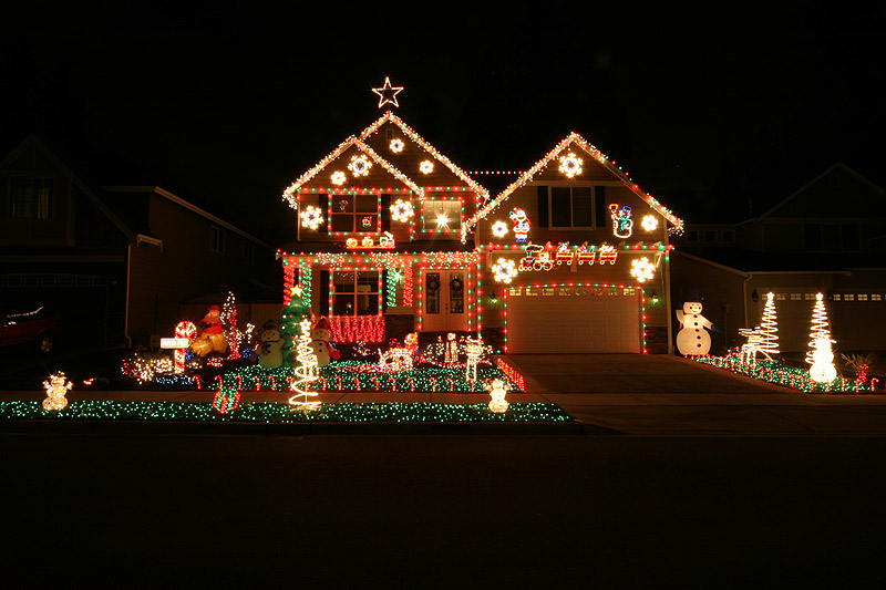 Tenho que colocar aqui a foto da casa do meu vizinho Pronto, olhem a foto aí, todos os dias eu chego em casa e eles adicionaram mais alguma coisa na decoração de Natal. Quando a gente acha que não cabe mais nada – tcharam! – aparece mais alguma luzinha, bonequinho, o escambau. Estamos especulando que eles entraram em algum concurso de decoração natalina, pra ter colocado tanta coisa assim. Para vocês terem uma idéia, até a grama foi coberta com luzinhas verdes e tem uma estrela iluminada no topo do telhado. Nem a cesta de basquete escapou!