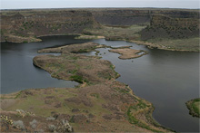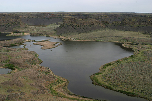 Pegamos a estrada e fomos no primeiro dia até Coulee City, onde ficam Dry Falls (Cachoeiras Secas), que na época dessa super enchente foram as maiores cataratas do mundo. Reparem na diferença da vegetação e paisagem do lado oeste do estado de Washington (super úmido, verde, cheio de pinheiros e montanhas) para o lado leste (super seco, poucas árvores, muitas colinas baixas). É um contraste absurdo atravessar as montanhas Cascades e passear pelo lado leste do estado, parece que você está em outro planeta.