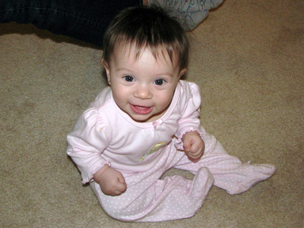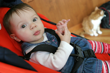 Hoje a Julia faz 7 meses – está muito esperta, começou a engatinhar esses dias, mas ainda não domina muito bem a técnica 😉 Está com um pouco mais de 8kg, comendo suas papinhas com gosto – a favorita é cenoura e batata-doce, com um pouquinho de cebola, e banana amassada de sobremesa. Não pode ver a gente comendo que começa a chorar querendo comer também. Dá muitas gargalhadas e sorri para todo mundo – durante a convenção todo mundo comentava como ela é um “happy baby”. Estou devendo fotos, eu sei, mas com a correria de viagem, mudança e visitas, não sei quando vou poder colocar fotos aqui ainda. Vou escolher pelo menos uma, só para vocês verem como ela cresceu!