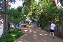 Quase chegando na doca de onde saem os barcos para passeios turísticos entra uma noiva na trilha, ela estava indo para o coreto bonitinho na beira do rio – onde os convidados e o noivo já esperavam por ela. Muito legal que aqui o pessoal casa onde quiser, e não deixa de ser engraçado ver uma noiva toda produzida andando na trilha do lado do pessoal passando correndo e de bicicleta. Logo depois do coreto tem o parque dos cachorros, tinham vários correndo enlouquecidos e nadando, um barato ver eles trazendo os frisbees lá do meio do rio para os donos nas margens.