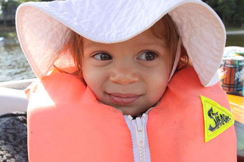 Mostrando o vestido que ganhou de uma tia, em Michigan De colete salva-vidas, pronta pra passear de barco pela primeira vez