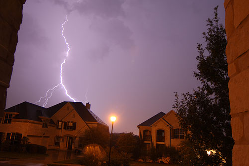 Aqui em Austin chove pouco normalmente e esse ano choveu menos ainda – estamos com uma das piores secas em muito tempo. Não estamos tendo racionamentos radicais ainda, mas proibiram de molhar a grama por exemplo desde agosto (ou julho, não lembro), tem que tomar muito cuidado com a água. Felizmente esse mês que passou choveu bastante e outubro começou com uma tempestade absurda. As tempestades vêm com força total e muitos relâmpagos, e o Gabe toda vez tenta fotografar os raios, sem muito sucesso. Dessa vez ele ficou um tempão lá fora com o tripé e conseguiu tirar uma foto legal. Nem preciso dizer que ele ficou todo feliz… 😉