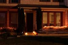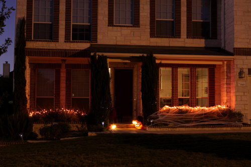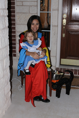 De lá viemos pra casa e fizemos uma decoração de Halloween último minuto (esse mês que passou choveu MUITO por aqui e eu não tinha feito decoração nenhuma com medo da ventania estragar tudo – pra vocês terem uma idéia, o vento levou o guarda sol da nossa mesa do quintal e quebrou o tampo de vidro). Sentamos do lado de fora como os nossos vizinhos aqui fazem e ficamos esperando as crianças chegarem pedindo doces. Julia achou o máximo e fez questão de distribuir os doces pras crianças – e de comer alguns também, claro. A nossa vizinha da frente fez uma decoração assustadora e nem passamos perto porque a Julia tem medo, eles colocaram uma máquina de fumaça que fez TANTA fumaça que a esquina inteira da rua ficou com um fog que parecia de verdade. Distribuímos mais de 300 doces, era criança que não acabava mais. Acabou que a nossa pequena “Alice” resolveu entrar pra jantar ao invés de sair pra pegar os seus próprios doces. Acho que ela não entendeu que ia ganhar uma montanha de chocolates e balas, mas tudo bem, ano que vem ela vai 😉