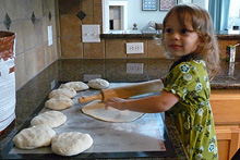 Se for fazer na mão – colocar a farinha e o sal em uma tigela, abrir um buraco no meio e acrescentar ali a água morna com o fermento e o açúcar já misturados e o azeite. Misturar com uma colher até que a farinha tenha absorvido a água. Aí é colocar a mão na massa e ir misturando tudo até conseguir formar uma bola de massa lisa e homogênea (quando conseguir fazer uma bola que desgrudar da tigela, continue trabalhando em uma superfície lisa e enfarinhada onde você poderá abrir a massa, que fica mais fácil). Sinceramente não lembro quanto tempo leva, acho que no mínimo uns 15 minutos. Divida a massa em 5-6 bolas menores (ou mais, dependendo do tamanho que você quer a pizza). Enfarinhar uma superfície lisa para abrir a massa (eu uso esse tapetinho de silicone anti-aderente muito legal). Posicione uma bola de massa no meio da superfície enfarinhada e abra com um rolo até que a massa fique na espessura e formato desejado.